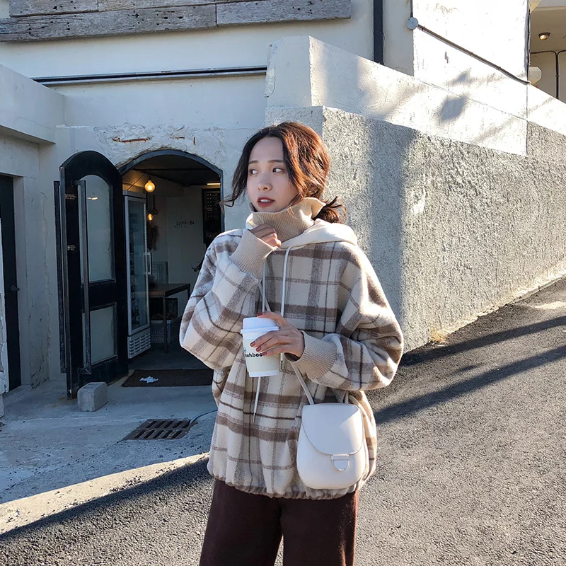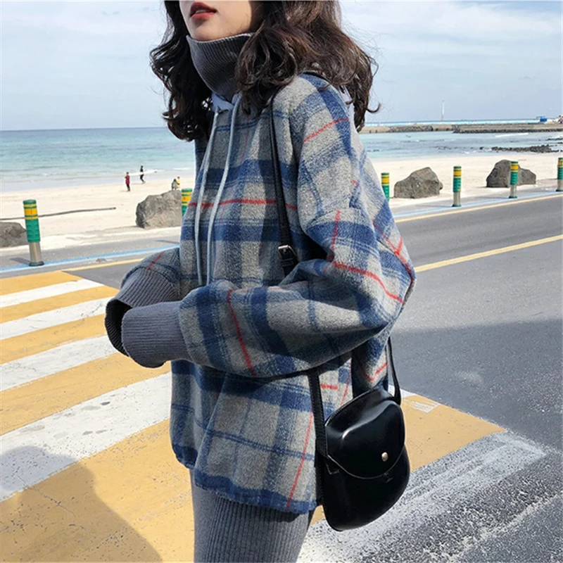 BEST QUALITY Hoodies Women Plaid Fashion Loose Korean Style Leisure All-match Womens Clothing Thickening Hooded
